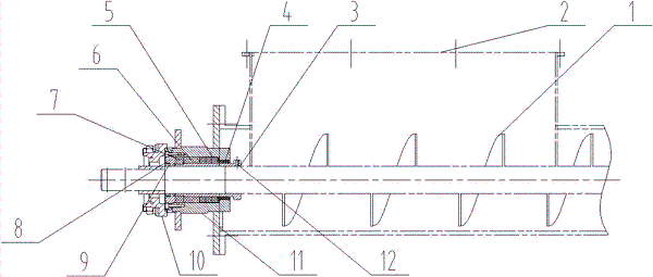 本技術新型涉及 螺旋輸送機 輸送領域,具體屬于應用于食品、化工、醫藥、糧食行業的螺旋輸送機防漏粉軸承密封裝置。 背景技術: 在化工、食品、醫藥、糧食行業,物料都需要有距離的輸送,螺旋輸送機是在這種情況下常用的輸送方式。現有的螺旋輸送機在使用時,常出現兩端密封座因密封不嚴,密封端物料泄露嚴重漏料,泄漏物滲入軸承內,就會造成螺旋輸送機運轉一段時間軸承座的軸承便會卡死。同時也會造成物料浪費,污染環境。 技術實現要素: 本技術的目的是提供一種螺旋輸送機防漏粉軸承密封裝置,為化工、醫