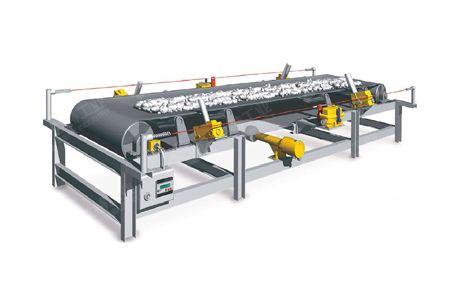 防撕裂保護裝置應安裝在皮帶落料點下方10-15m處(頭部驅動時)。安裝在輸送帶上下膠帶之間,保護方式為壓電或牽引鋼絲繩。當發生縱向撕裂時,裝置報警并終止運行。